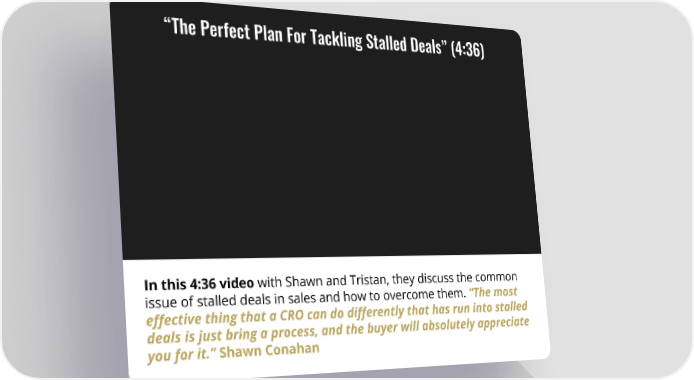 “The Perfect Plan For Tackling Stalled Deals” (4:36) In this 4:36 video with Shawn and Tristan, they discuss the common issue of stalled deals in sales and how to overcome them. “The most effective thing that a CRO can do differently that has run into stalled deals is just bring a process, and the buyer will absolutely appreciate you for it.” Shawn Conahan