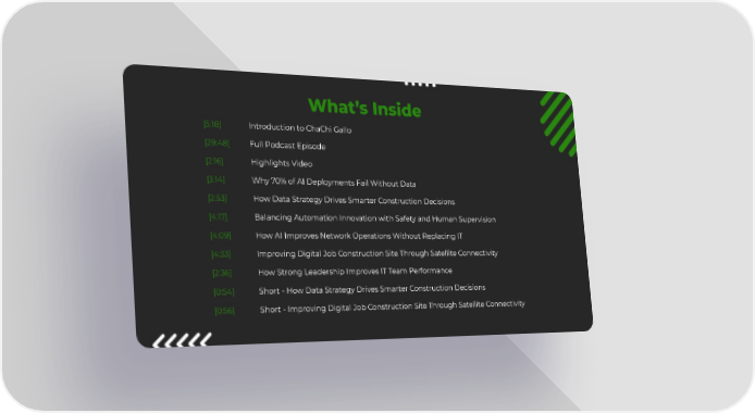 What’s Inside [5:18] Introduction to ChaChi Gallo [29:48] Full Podcast Episode [2:16] Highlights Video [3:14] Why 70% of AI Deployments Fail Without Data [2:53] How Data Strategy Drives Smarter Construction Decisions [4:17] Balancing Automation Innovation with Safety and Human Supervision [4:09] How AI Improves Network Operations Without Replacing IT [4:33] Improving Digital Job Construction Site Through Satellite Connectivity [2:36] How Strong Leadership Improves IT Team Performance [0:54] Short - How Data Strategy Drives Smarter Construction Decisions [0:56] Short - Improving Digital Job Construction Site Through Satellite Connectivity