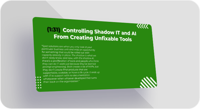 (1:31) Controlling Shadow IT and AI From Creating Unfixable Tools “Spot solutions are when you only look at your particular business unit and miss an opportunity for something that could be rolled out with capacity already in place. The shadow is what we don’t really know, and now, with the shadow AI, there’s a proliferation of tools and people who think they can do IT work just because they've learned prompt engineering. Both create a lot of MVPs, but they don’t create final products that are supportable, scalable, or have a life cycle. It ends up with IT to support with no documentation whatsoever when whoever developed that turns their back on the organization.”