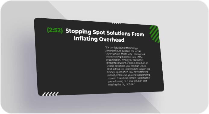 8 (2:52) Stopping Spot Solutions From Inflating Overhead βIt's our job, from a technology perspective, to support the whole organization. That's why I always talk about having a holistic view of the organization. When you talk about different solutions, if one is based on an Oracle database, you need an Oracle DBA. I don't see Oracle DBAs supporting MS SQL quite often. You have different skillset profiles. So, you end up spending more in this whole context just because you're looking at a spot solution and missing the big picture.β