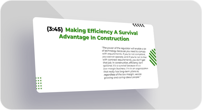 (3:45) Making Efficiency A Survival Advantage In Construction “The power of the regulator will enable a lot of technology because you need to comply with requirements. If you’re not compliant, you cannot operate, and if you’re not in line with contract requirements, you don’t get that job. In construction, efficiency isn't optional. It's a survival because it's a low-margin business. I'm in an organization that really has long-term plans so, regardless of the low margin, we are growing and caring about people.”