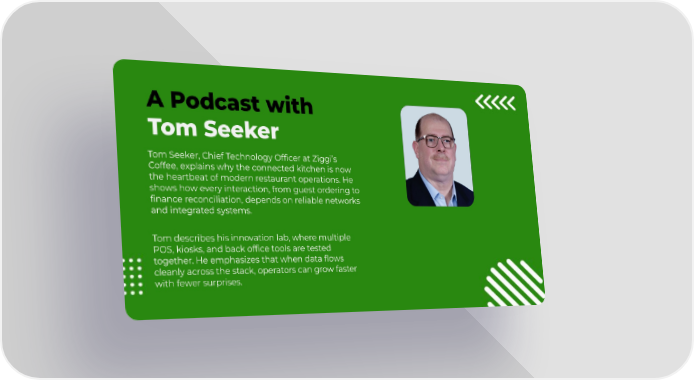 EPISODE: A Podcast with Tom Seeker Tom Seeker, Chief Technology Officer at Ziggi’s Coffee, explains why the connected kitchen is now the heartbeat of modern restaurant operations. He shows how every interaction, from guest ordering to finance reconciliation, depends on reliable networks and integrated systems. Tom describes his innovation lab, where multiple POS, kiosks, and back office tools are tested together. He emphasizes that when data flows cleanly across the stack, operators can grow faster with fewer surprises.