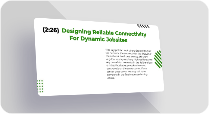 (2:26) Designing Reliable Connectivity For Dynamic Jobsites βThe key points I look at are the resiliency of the network, the connectivity, the failover of the network itself, and latency. We want very low latency and very high resiliency. We rely on cellular networks in the field and use a mixed-basket approach where not everyone is on the same carrier. If one carrier goes down, we may still have someone in the field not experiencing issues.β