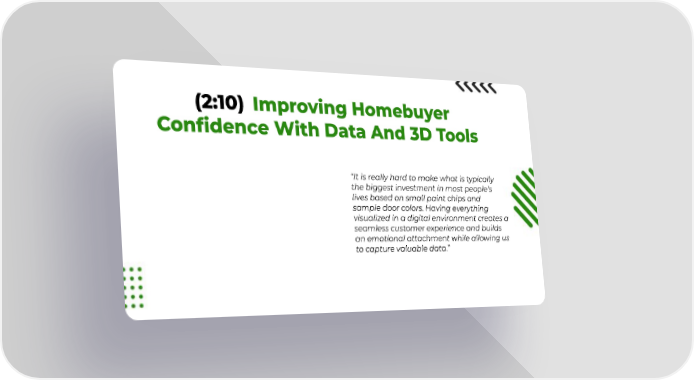 (2:10) Improving Homebuyer Confidence With Data And 3D Tools “It is really hard to make what is typically the biggest investment in most people’s lives based on small paint chips and sample door colors. Having everything visualized in a digital environment creates a seamless customer experience and builds an emotional attachment while allowing us to capture valuable data.”