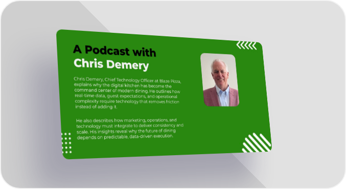EPISODE: A Podcast with Chris Demery Chris Demery, Chief Technology Officer at Blaze Pizza, explains why the digital kitchen has become the command center of modern dining. He outlines how real-time data, guest expectations, and operational complexity require technology that removes friction instead of adding it. He also describes how marketing, operations, and technology must integrate to deliver consistency and scale. His insights reveal why the future of dining depends on predictable, data-driven execution.