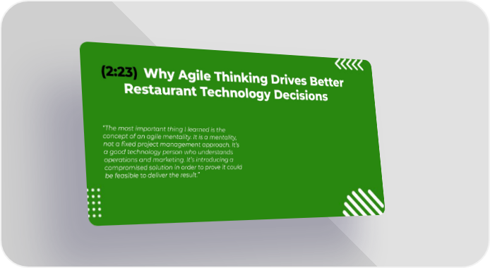 (2:23) Why Agile Thinking Drives Better Restaurant Technology Decisions “The most important thing I learned is the concept of an agile mentality. It is a mentality, not a fixed project management approach. It’s a good technology person who understands operations and marketing. It’s introducing a compromised solution in order to prove it could be feasible to deliver the result.”