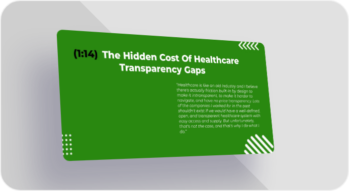 (1:14) The Hidden Cost Of Healthcare Transparency Gaps “Healthcare is like an old industry and I believe there's actually friction built-in by design to make it intransparent, to make it harder to navigate, and have no price transparency. Lots of the companies I worked for in the past shouldn't exist if we would have a well-defined, open, and transparent healthcare system with easy access and supply. But unfortunately, that's not the case, and that's why I do what I do.”