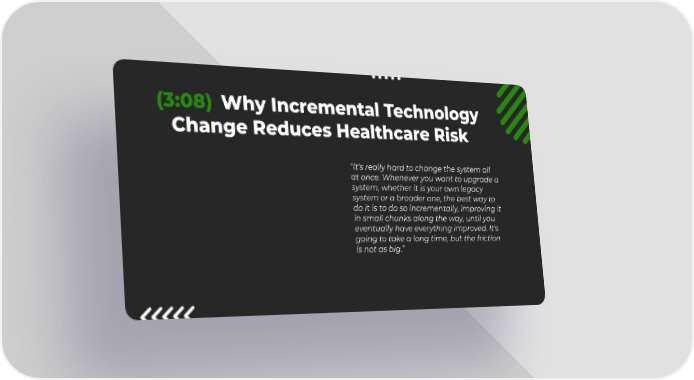 8 (3:08) Why Incremental Technology Change Reduces Healthcare Risk βIt's really hard to change the system all at once. Whenever you want to upgrade a system, whether it is your own legacy system or a broader one, the best way to do it is to do so incrementally, improving it in small chunks along the way, until you eventually have everything improved. It's going to take a long time, but the friction is not as big.β