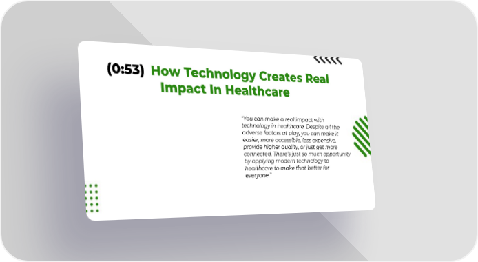 (0:53) How Technology Creates Real Impact In Healthcare “You can make a real impact with technology in healthcare. Despite all the adverse factors at play, you can make it easier, more accessible, less expensive, provide higher quality, or just get more connected. There’s just so much opportunity by applying modern technology to healthcare to make that better for everyone.”
