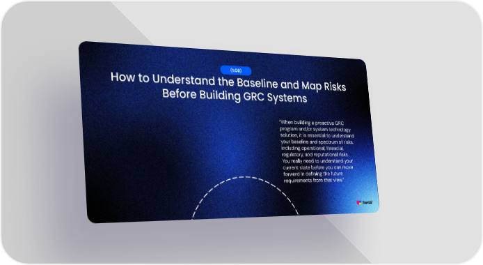 How to Understand the Baseline and Map Risks Before Building GRC Systems (1:08) “When building a proactive GRC program and/or system technology solution, it is essential to understand your baseline and spectrum of risks, including operational, financial, regulatory, and reputational risks. You really need to understand your current state before you can move forward in defining the future requirements from that view.”