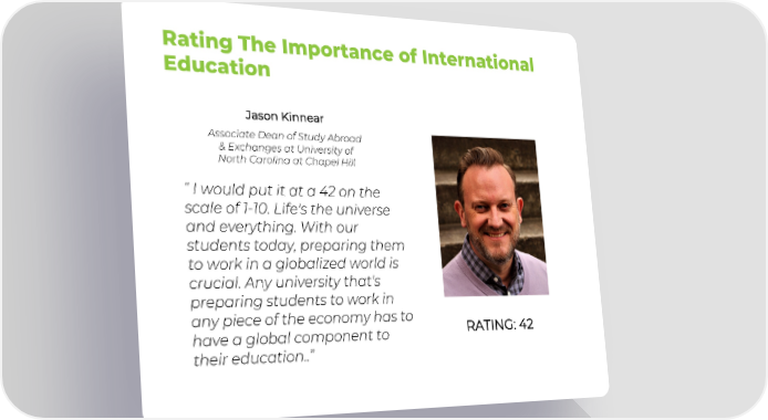 Rating The Importance of International Education Jason Kinnear Associate Dean of Study Abroad & Exchanges at University of North Carolina at Chapel Hill ” I would put it at a 42 on the scale of 1-10. Life's the universe and everything. With our students today, preparing them to work in a globalized world is crucial. Any university that's preparing students to work in any piece of the economy has to RATING: 42 have a global component to their education..”
