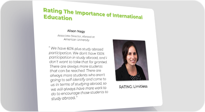 Rating The Importance of International Education Alison Nagy Associate Director, Abroad at American University ” We have 60% plus study abroad participation. We don't have 100% participation in study abroad, and I don't want to take that for granted. There are always more students that can be reached. There are always more students who aren't going to self-identify and come to us in terms of studying abroad, so we will always have more work to RATING: Limitless do to encourage those students to study abroad.."