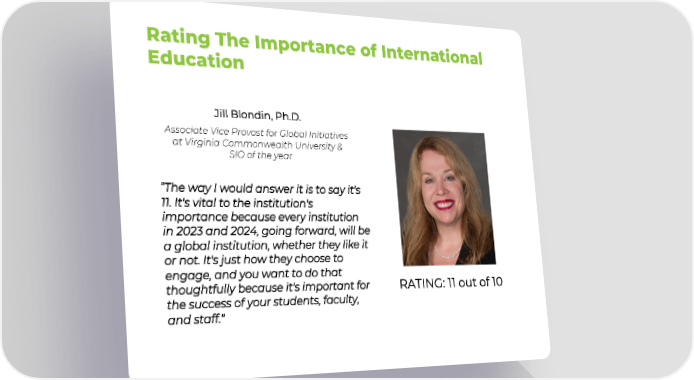 Rating The Importance of International Education Jill Blondin, Ph.D. Associate Vice Provost for Global Initiatives at Virginia Commonwealth University & SIO of the year ”The way I would answer it is to say it's 11. It's vital to the institution's importance because every institution in 2023 and 2024, going forward, will be a global institution, whether they like it or not. It's just how they choose to engage, and you want to do that thoughtfully because it's important for RATING: 11 out of 10 the success of your students, faculty, and staff."