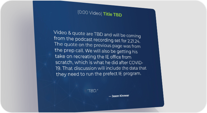 (0:00 Video) Title TBD Video & quote are TBD and will be coming from the podcast recording set for 2.21.24. The quote on the previous page was from the prep call. We will also be getting his take on recreating the IE office from scratch, which is what he did after COVID- 19. That discussion will include the data that they need to run the prefect IE program. ”TBD." —Jason Kinnear