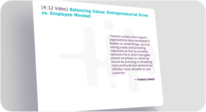 (4:12 Video) Balancing Value: Entrepreneurial Drive vs. Employee Mindset “Contact centers and support organizations have developed a fixation on small things, such as closing cases and providing responses as fast as possible, because this is what managers placed emphasis on. What we should be pursuing is something more profound and abstract but infinitely more valuable to your customer.” — THOMAS LEHNER