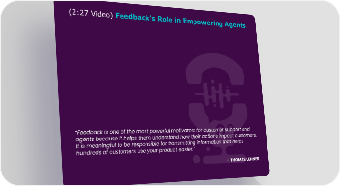 (2:27 Video) Feedback’s Role in Empowering Agents “Feedback is one of the most powerful motivators for customer support and agents because it helps them understand how their actions impact customers. It is meaningful to be responsible for transmitting information that helps hundreds of customers use your product easier.” - THOMAS LEHNER