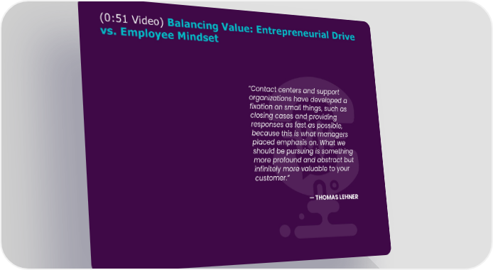(0:51 Video) Balancing Value: Entrepreneurial Drive vs. Employee Mindset “Contact centers and support organizations have developed a fixation on small things, such as closing cases and providing responses as fast as possible, because this is what managers placed emphasis on. What we should be pursuing is something more profound and abstract but infinitely more valuable to your customer.” — THOMAS LEHNER