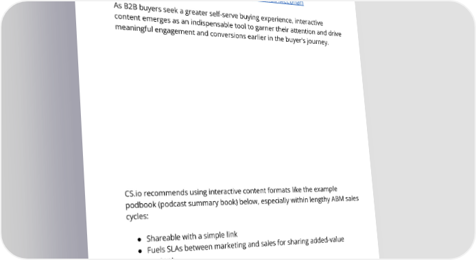 TheImpactofInteractive Content "The mediumisthemessage."-MarshallMcLuhan AsB2Bbuyersseekagreaterself-servebuyingexperience,interactive content emergesasanindispensabletooltogarnertheirattentionanddrive meaningfulengagementandconversionsearlierinthebuyer'sjourney. CS.io recommendsusinginteractivecontentformatsliketheexample podbook(podcastsummarybook)below,especiallywithinlengthyABMsales cycles: ● Shareablewithasimplelink ● FuelsSLAsbetweenmarketingandsalesforsharingadded-value content ● Providesself-guided exploration ● Easyforbuyerstosharewithinthebuyingcommittee 6
