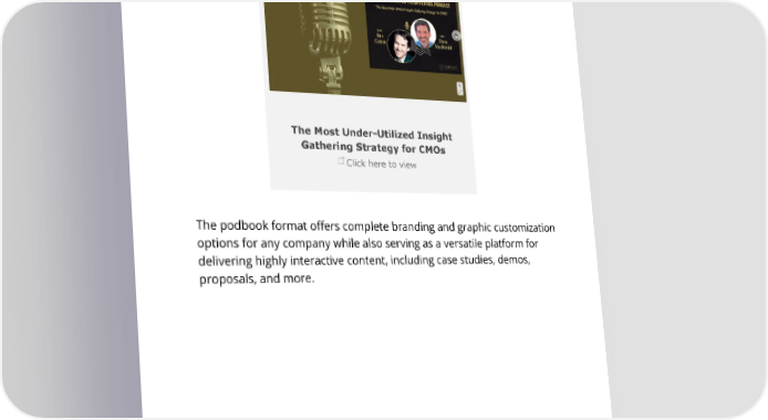TheMostUnder-Utilized Insight Gathering Strategy for CMOs Click here to view Thepodbookformatofferscompletebrandingandgraphiccustomization options for any company while also serving as a versatile platform for delivering highly interactive content, including case studies, demos, proposals, and more. 7