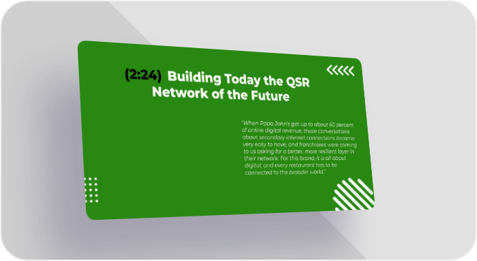(2:24) Building Today the QSR Network of the Future “When Papa John’s got up to about 60 percent of online digital revenue, those conversations about secondary internet connections became very easy to have, and franchisees were coming to us asking for a better, more resilient layer in their network. For this brand, it is all about digital, and every restaurant has to be connected to the broader world.”