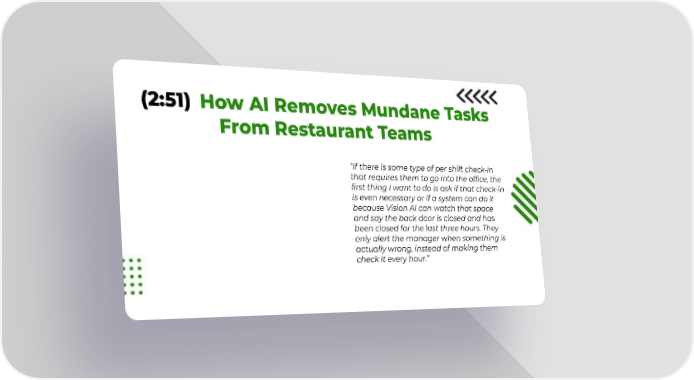 (2:51) How AI Removes Mundane Tasks From Restaurant Teams “If there is some type of per shift check-in that requires them to go into the office, the first thing I want to do is ask if that check-in is even necessary or if a system can do it because Vision AI can watch that space and say the back door is closed and has been closed for the last three hours. They only alert the manager when something is actually wrong, instead of making them check it every hour.”