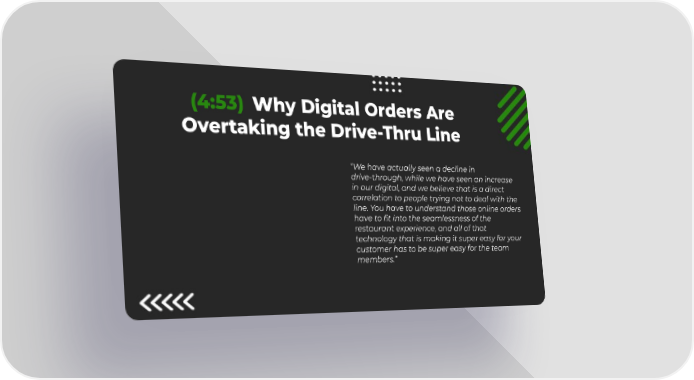 8 (4:53) Why Digital Orders Are Overtaking the Drive-Thru Line “We have actually seen a decline in drive-through, while we have seen an increase in our digital, and we believe that is a direct correlation to people trying not to deal with the line. You have to understand those online orders have to fit into the seamlessness of the restaurant experience, and all of that technology that is making it super easy for your customer has to be super easy for the team members.”