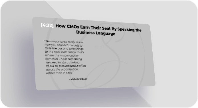 [4:32] How CMOs Earn Their Seat By Speaking the Business Language The importance really lies in how you connect the dots to raise the bar and take things to the next level. I think thats where the misconception comes in. This is something we need to start thinking about as a collaborative effort across the organization, rather than in silos. Michelle Urdiales