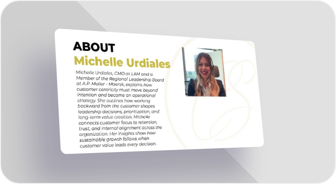 ABOUT Michelle Urdiales Michelle Urdiales, CMO at LAM and a Member of the Regional Leadership Board at A.P. Moller - Maersk, explains how customer centricity must move beyond intention and become an operational strategy. She outlines how working backward from the customer shapes leadership decisions, prioritization, and long-term value creation. Michelle connects customer focus to retention, trust, and internal alignment across the organization. Her insights show how sustainable growth follows when customer value leads every decision.