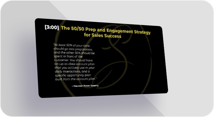 [3:00] The 50/50 Prep and Engagement Strategy for Sales Success “At least 50% of your time should go into preparation, and the other 50% should be spent in front of the customer. You should have an up-to-date account plan that you actively use in your daily interactions, and a specific opportunity plan built from the account plan.” – Maureen Power Sweeny