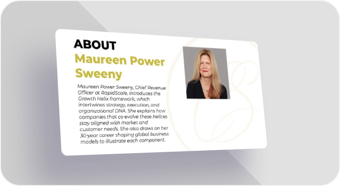 ABOUT Maureen Power Sweeny Maureen Power Sweeny, Chief Revenue Officer at RapidScale, introduces the Growth Helix framework, which intertwines strategy, execution, and organizational DNA. She explains how companies that co‑evolve these helices stay aligned with market and customer needs. She also draws on her 30‑year career shaping global business models to illustrate each component.