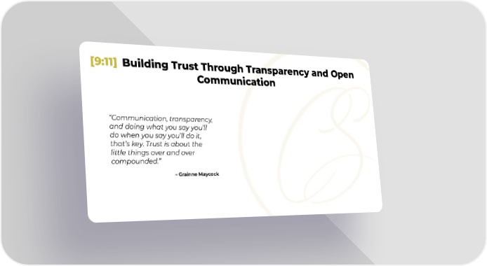 [9:11] Building Trust Through Transparency and Open Communication Communication, transparency, and doing what you say youll do when you say youll do it, thats key. Trust is about the little things over and over compounded. Grainne Maycock