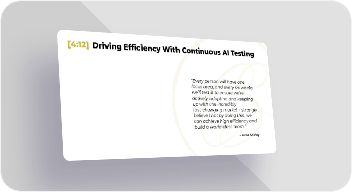 [4:12] Driving Efficiency With Continuous AI Testing “Every person will have one focus area, and every six weeks, we’ll test it to ensure we’re actively adopting and keeping up with the incredibly fast-changing market. I strongly believe that by doing this, we can achieve high efficiency and build a world-class team.” – Luna Shirley