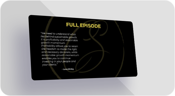 FULL EPISODE “We need to understand what lies behind sustainable growth. It is profitability and reasonable growth momentum. Profitability allows you to retain the freedom to make the right and necessary decisions, while reasonable growth momentum enables you to continue investing in your people and your clients.” – Luna Shirley